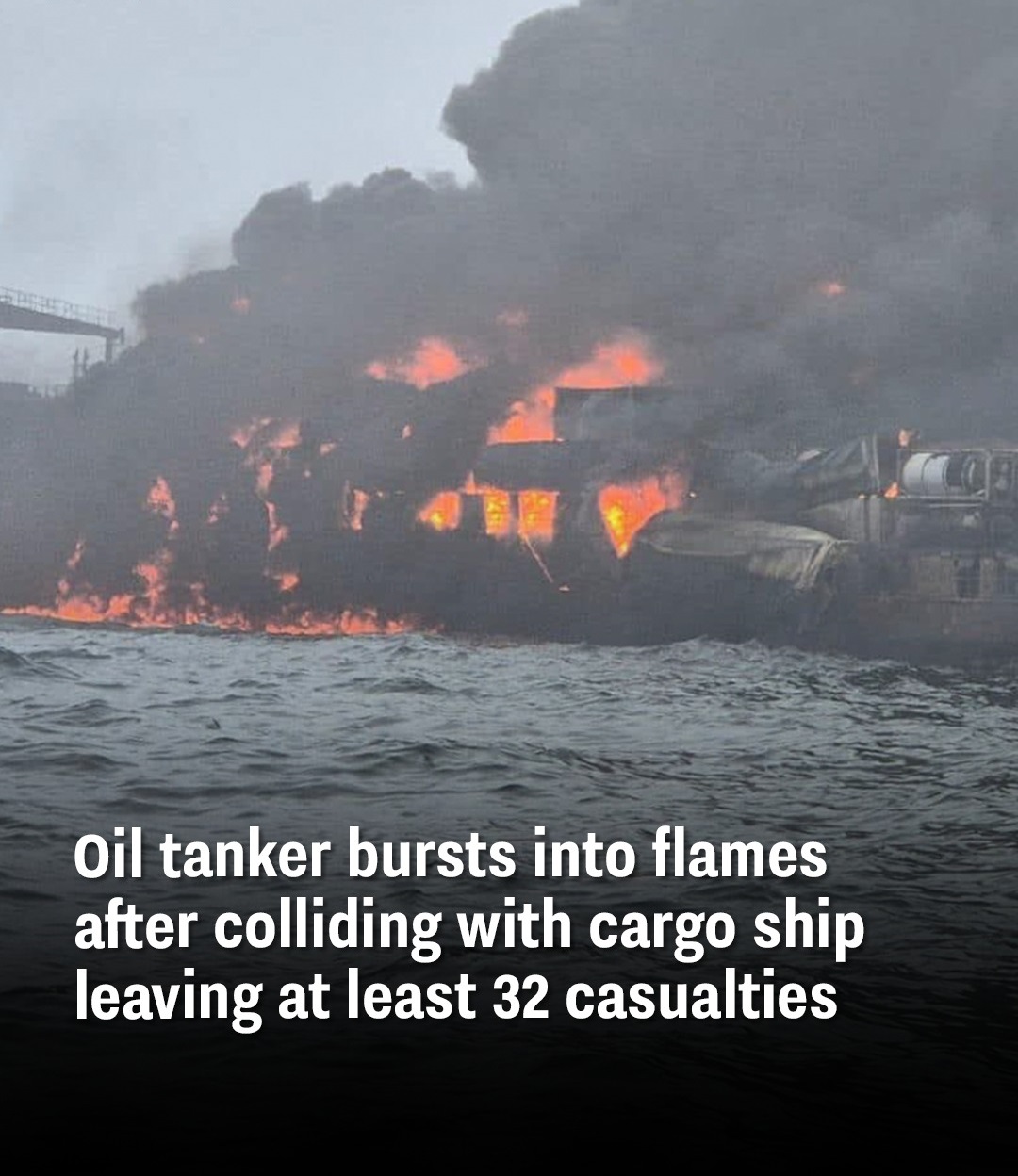 Oil tanker bursts into flames after colliding with cargo ship leaving at least 32 casualties