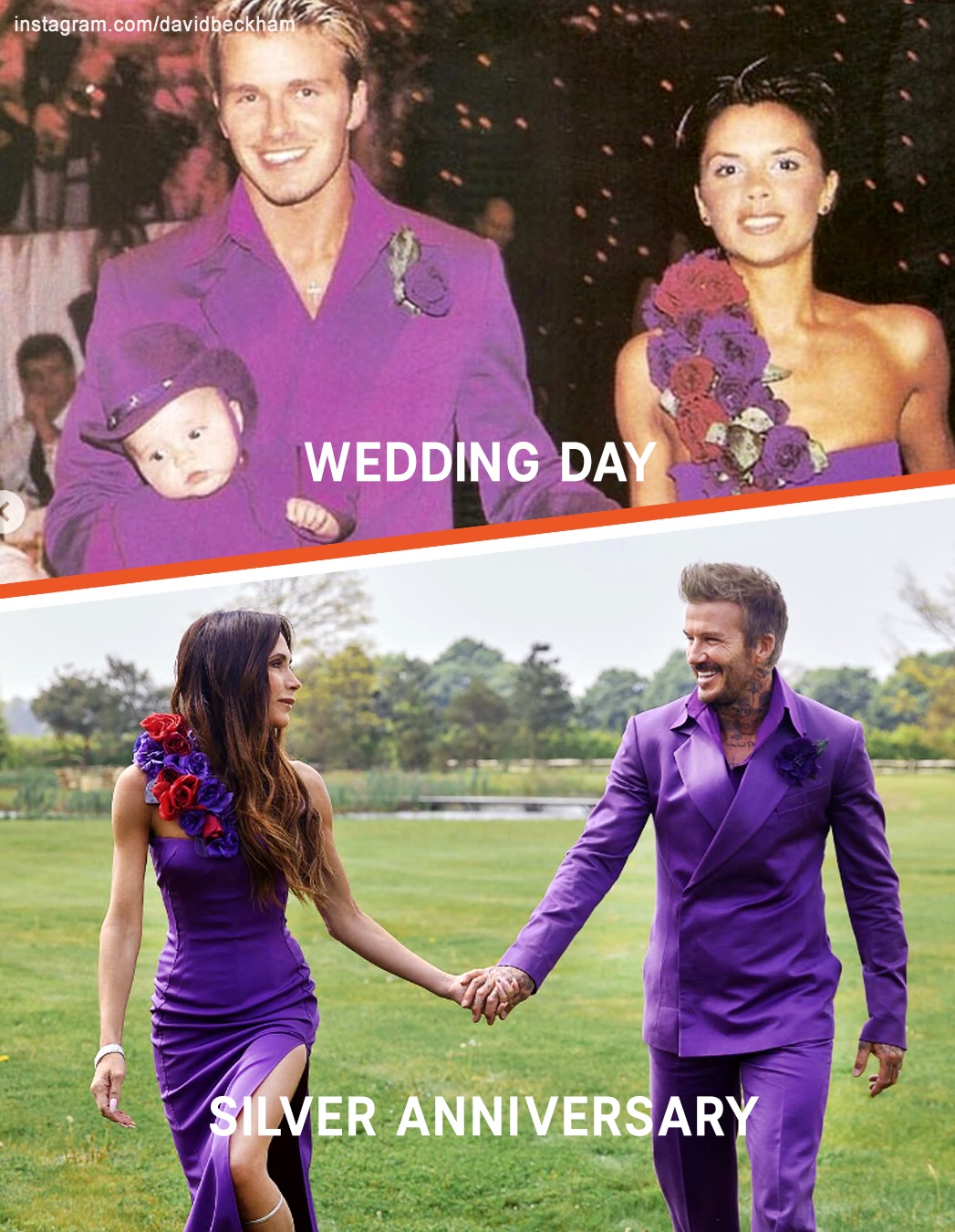 The couple has been married for 25 years since, and recently took to social media to commemorate their milestone together. In a joint Instagram post, Victoria and David posted a photo of them rocking similar purple outfits from their wedding day. “Look what we found…” they captioned the post.
