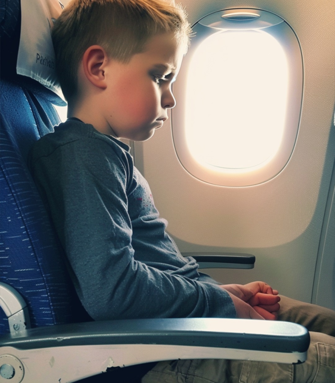 A nervous little boy sitting in his plane seat | Source: Midjourney