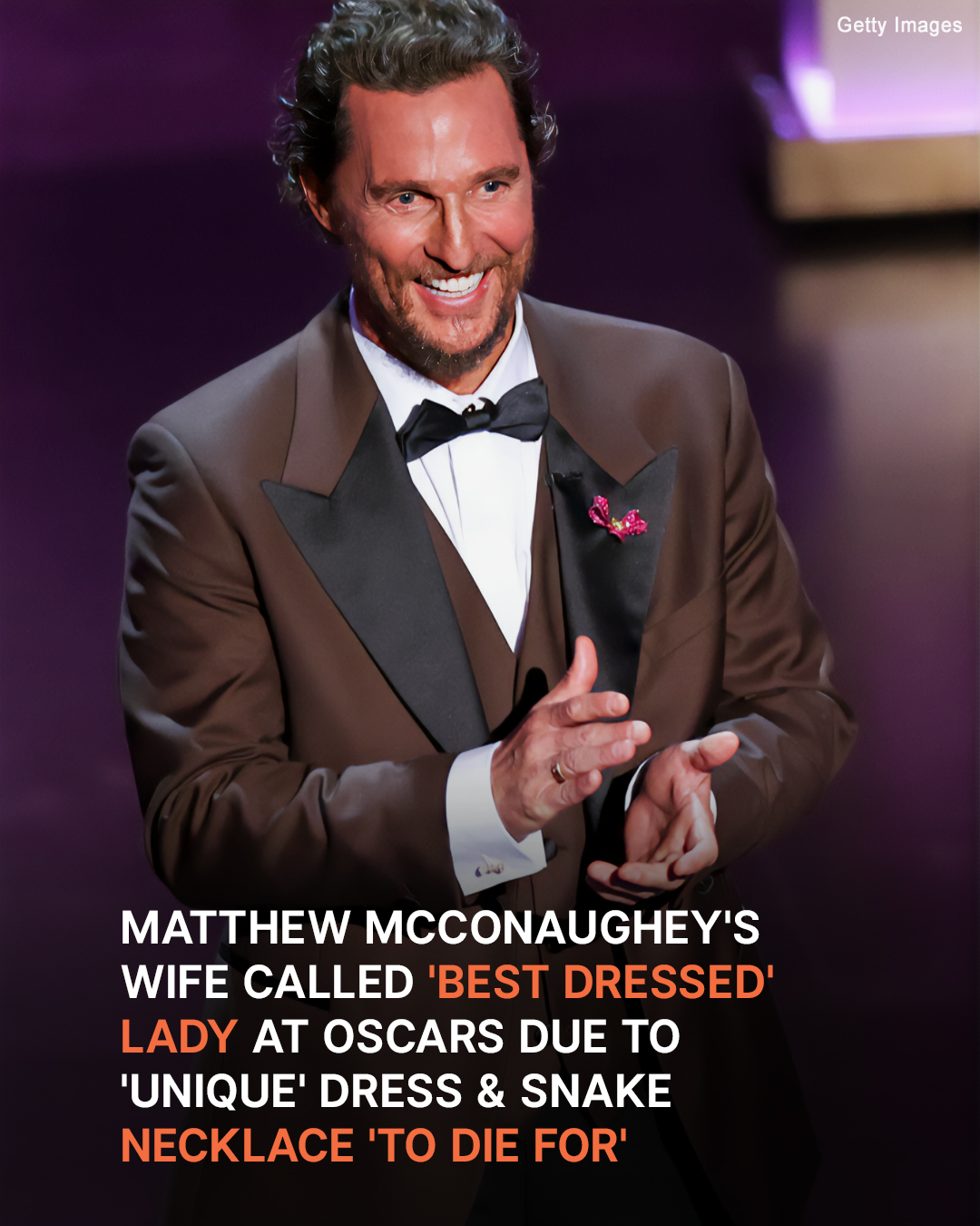 While Matthew McConaughey’s wife was wowing the audience with her fashion statement, he wore a simple dark-brown suit by Versace with a white button-up shirt and a black bowtie.