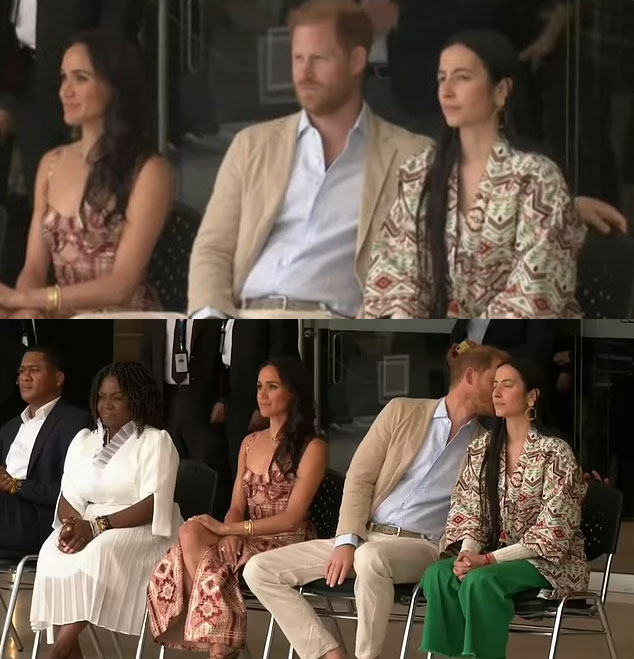 As the couple watched the colorful “Kiss of the Hummingbird” performance, Meghan, 43, maintained a poised and elegant posture, sitting upright and fully engaged with the spectacle. Her husband, Prince Harry, 39, on the other hand, appeared more at ease, leaning back in his chair and even resting his arm casually on the back of the translator’s chair seated beside him. This relaxed gesture didn’t go unnoticed, with royal fans quickly taking to social media to humorously speculate that the Duke might be risking a gentle rebuke from his wife.
